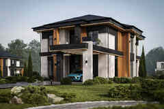 Первый этаж может включать КУХНЮ-ГОСТИНУЮ - просторное и светлое пространство для семьи и гостей; кабинет - для работы и творчества; а также дополнительные удобные зоны, подстраивающиеся под ваши потребности.