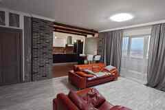 Кухня-гостиная с панорамным окном: Кухонный гарнитур по индивидуальному проекту, встроенная техника (холодильник, СВЧ), дизайнерская обеденная группа и зона отдыха с креслом-кроватью. ТВ 43" и кондиционер.