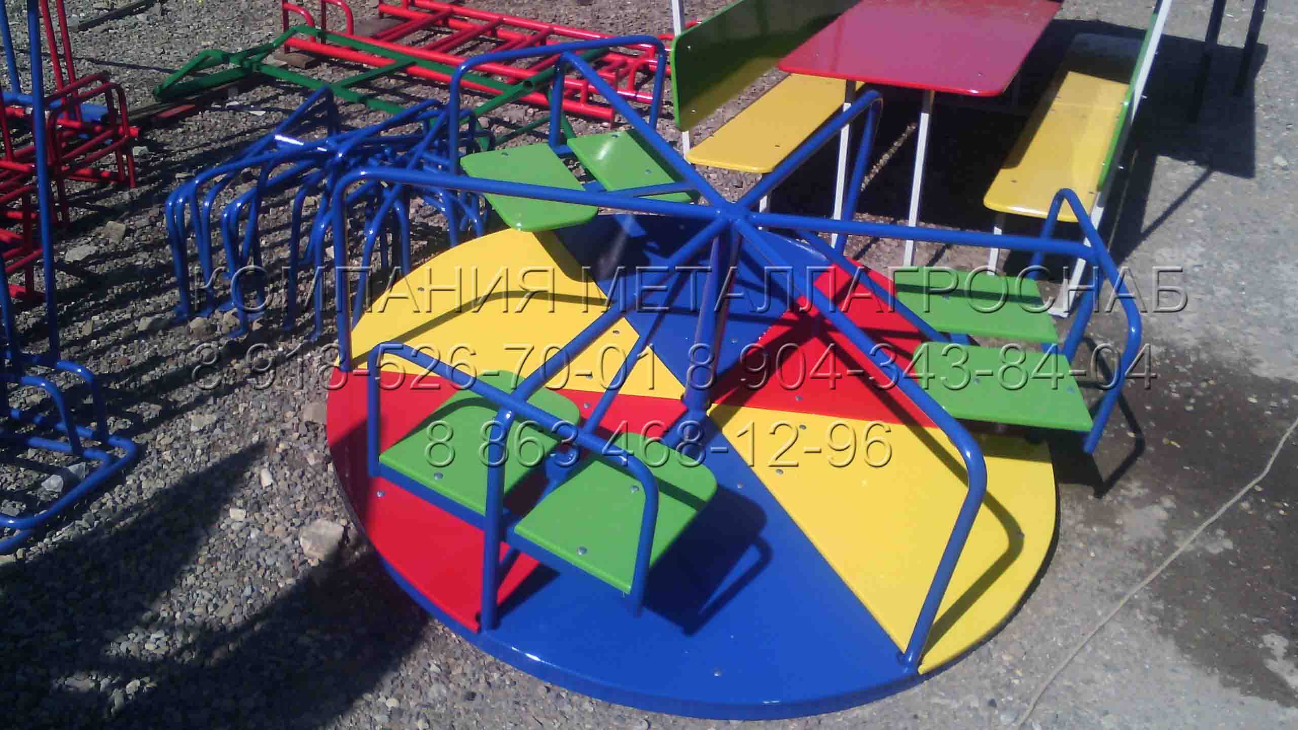 Детская карусель для улицы и дачи — одна из приоритетных задач нашего производства, мы изготавливаем разные виды детских каруселей. Все детские карусели изготавливаются по техническому регламенту ГОСТ и ТУ, что обеспечивает качество и надежность в эксплуатации детской карусели. Детская карусель состоит из металлического каркаса и из деревянных сидений с полами. В нашем производстве детских каруселей применяется влагостойкие краски и оцинкованные крепления с заглушками для безопасности. Вся металлическая конструкция детской карусели окрашивается порошковыми красками различных цветов. Детская карусель производится из металлической трубы диаметром 20 мм, толщиной стенки 2,5 мм, по центру карусели приваривается металлическая труба диаметром 89 мм, толщиной стенки 3 мм, которая служит основой детской карусели, и в дальнейшем в эту трубу вставляется подшипник, на котором вращается детская карусель. Внизу детской карусели по всему диаметру приваривается каркас из профильной трубы размером 40х20 мм. Также при изготовлении детских каруселей используется влагостойкая лакированная фанера толщиной 16 мм, а сидушки детской карусели изготавливаются из дерева толщиной 16 мм. Габаритные размеры детской карусели: длина 1520 мм, ширина 1520 мм, высота 800 мм, вес карусели шестиместной 80 кг. По желанию наши покупатели могут выбрать различные цвета покраски детских каруселей. Купить детскую карусель в Таганроге, Ростове-на-Дону, Краснодаре, Ставрополе, Воронеже, Тамбове, Липецке по цене 33 000 рублей оптом и в розницу. При заказе детской карусели мы быстро организуем доставку транспортными компаниями либо собственным транспортом в города Ростов-на-Дону, Таганрог, Краснодар, Ставрополь, Нальчик, Грозный, Воронеж, Белгород, Курск, Липецк, Волгоград, Самара, Уфа, Казань, Тула, Владимир, Тамбов, Киров, Саратов, Калуга, Екатеринбург, Москва. Ждем Ваших покупок и предложений! С Уважением, Компания «МеталлАгроСнаб».