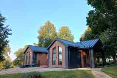 На участке 2,45 Га, премыкающем к водоему в березовой роще располагаются каркасные дома-барн 60 кв.м, с 1 и 2 спальнями, отделка имитация бруса, металлопрофиль антрацит, окна Рехау, утеплитель минеральная вата 150-200 мм, потолки от 3 м. :В 2 х- идет внутренняя отделка , 2 - собран каркас (материалы есть), 1 - сделан фундамент свайно винтовой.
