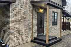 Стены: наружные стены 40 см, керамзитобетонные блоки обложены лицевым кирпичом, внутренние перегородки керамзитобетонные блоки 30 см ширины, через 8 рядов проложены армированной сеткой, 1 этаж стянут бетонным поясом.